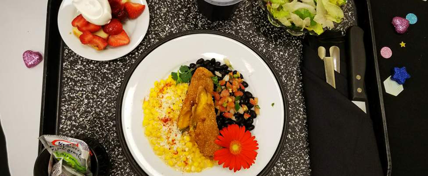 - Cheddar stuffed poblano chile relleno (vegetarian option) with zesty cheese sauce, elote corn and simmered black beans, a choice of Caesar or garden salad, dessert and beverage