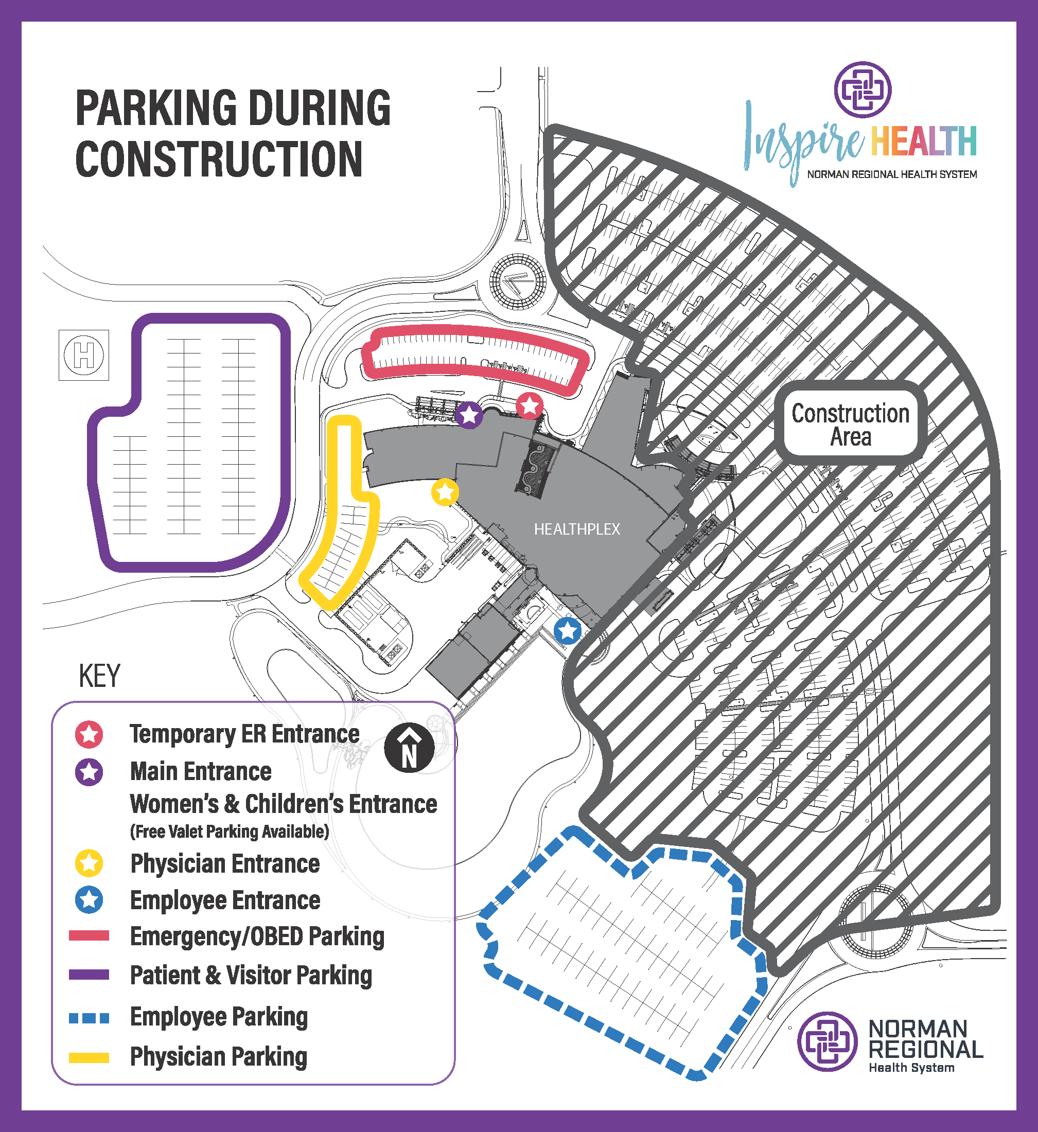 Additional parking lots have been built to accommodate patients, visitors, physicians and employees.– The patient and visitor parking lot will be located west of the hospital in Lot F, just south of the West Norman Professional Building. Complimentary valet parking is available. There is also emergency parking available just north of the new Emergency Department entrance.