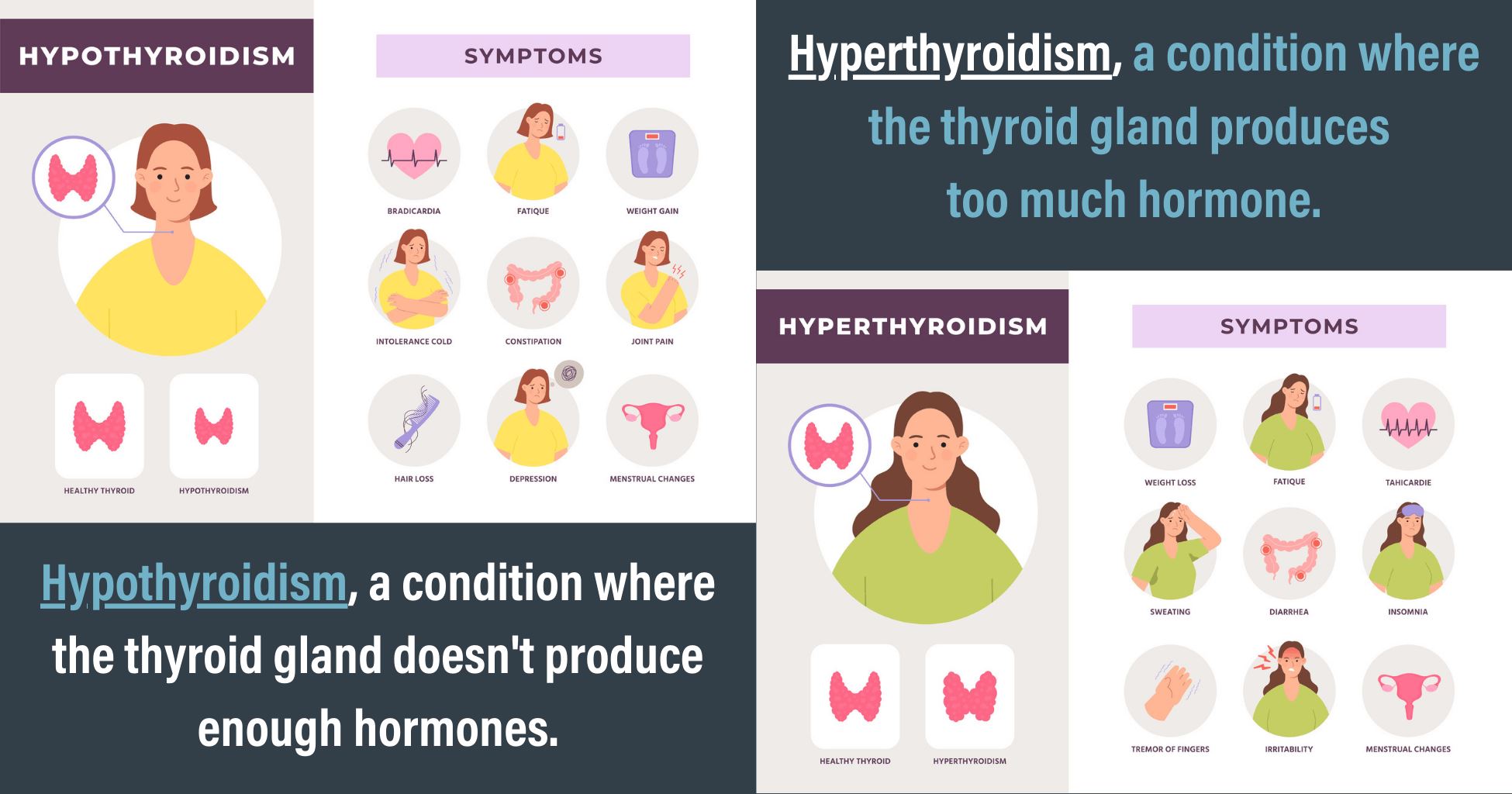 Hypothyroidism, a condition where the thyroid gland doesn't produce enough hormones, and hyperthyroidism, a condition where the gland produces too much hormone.