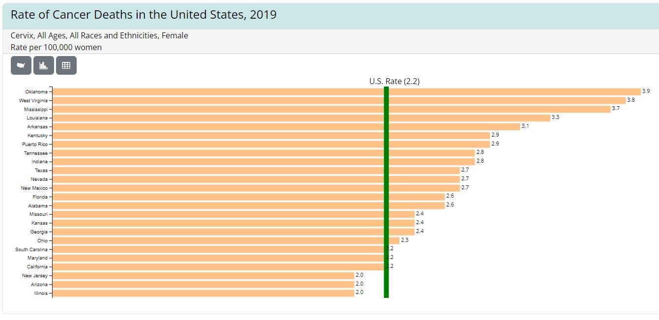 In Oklahoma, the rate of cervical cancer is the highest in the nation. According to the CDC and the Oklahoma State Department of Health, as of 2019, the state's cervical cancer incidence rate is 10.3 per 100,000 women, compared to the national average of 7.5 per 100,000 women.