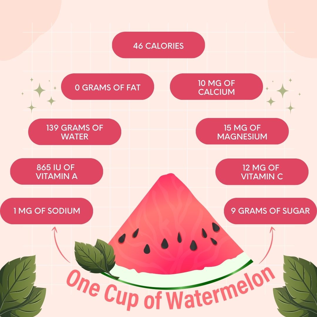 According to the USDA, one cup of diced watermelon contains 46 calories, 0 grams of fat, 10 mg of calcium, 15 mg of magnesium, 139 grams of water, 865 IU of vitamin A, 12 mg of vitamin C, 1 mg of sodium, and 9 grams of sugar.