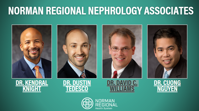 Norman Regional Nephrology Associates is located at 1553 N. Porter Ave., for information and appointments, Drs. Knight, Nguyen, Tedesco and Williams are all board certified and look forward to continuing to serve patients. A physician referral is required for new patients to see a physician at Nephrology Associates.