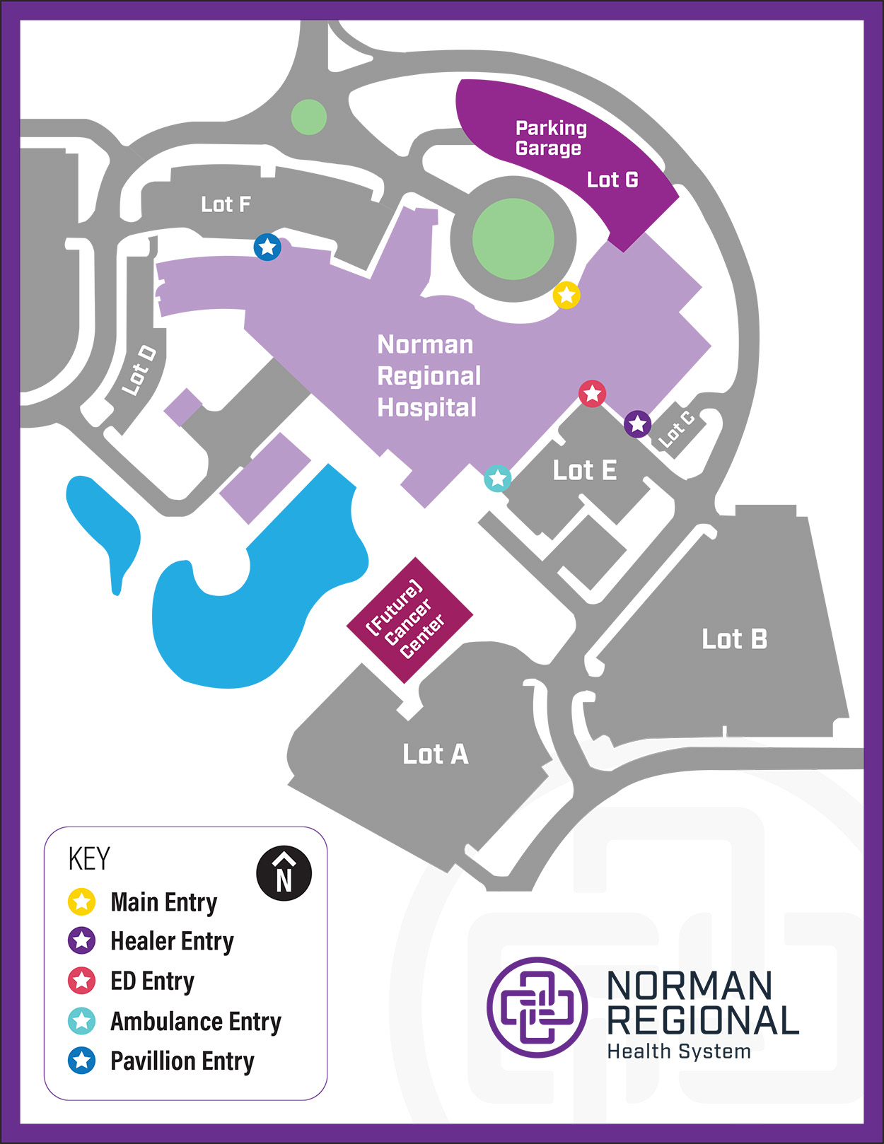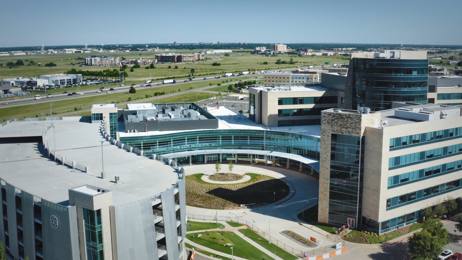 Hospital patients can enter Norman Regional Hospital through the main entrance on Hospital Parkway, where they will follow the roundabout towards the circular entrance to drop off patients or visitors at the main door.