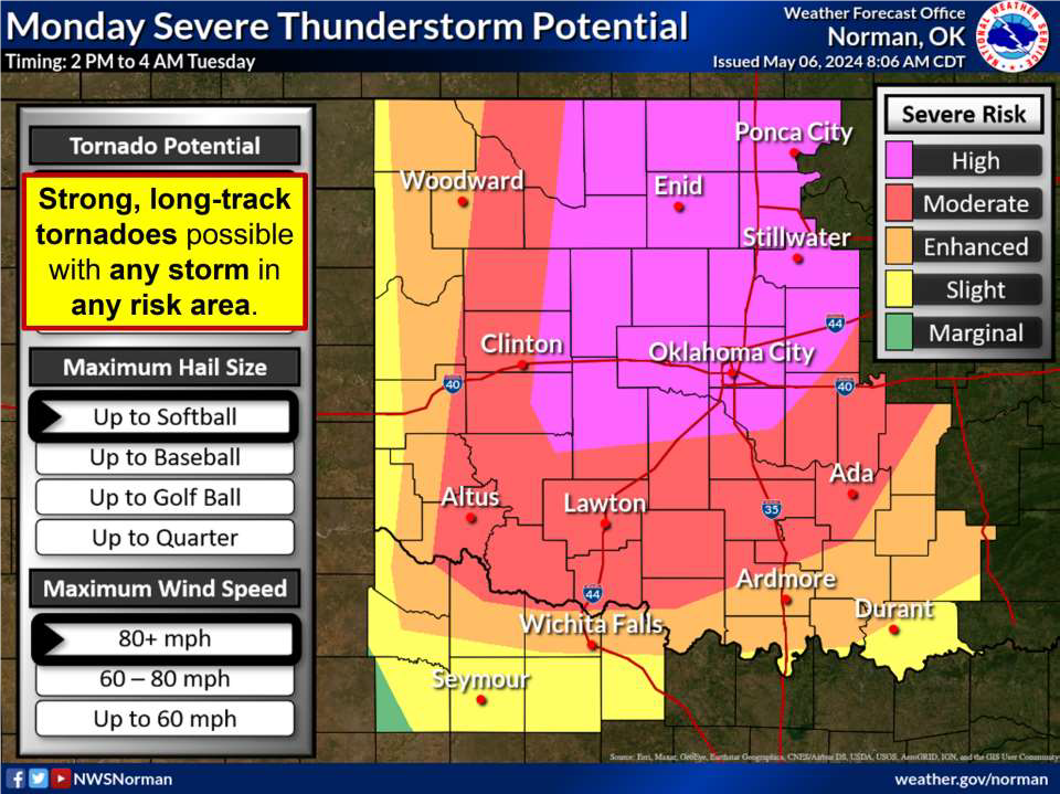 Today's weather forecast indicates the potential for a severe weather outbreak, with the possibility of dangerous storms across Oklahoma. Please note the following key points: