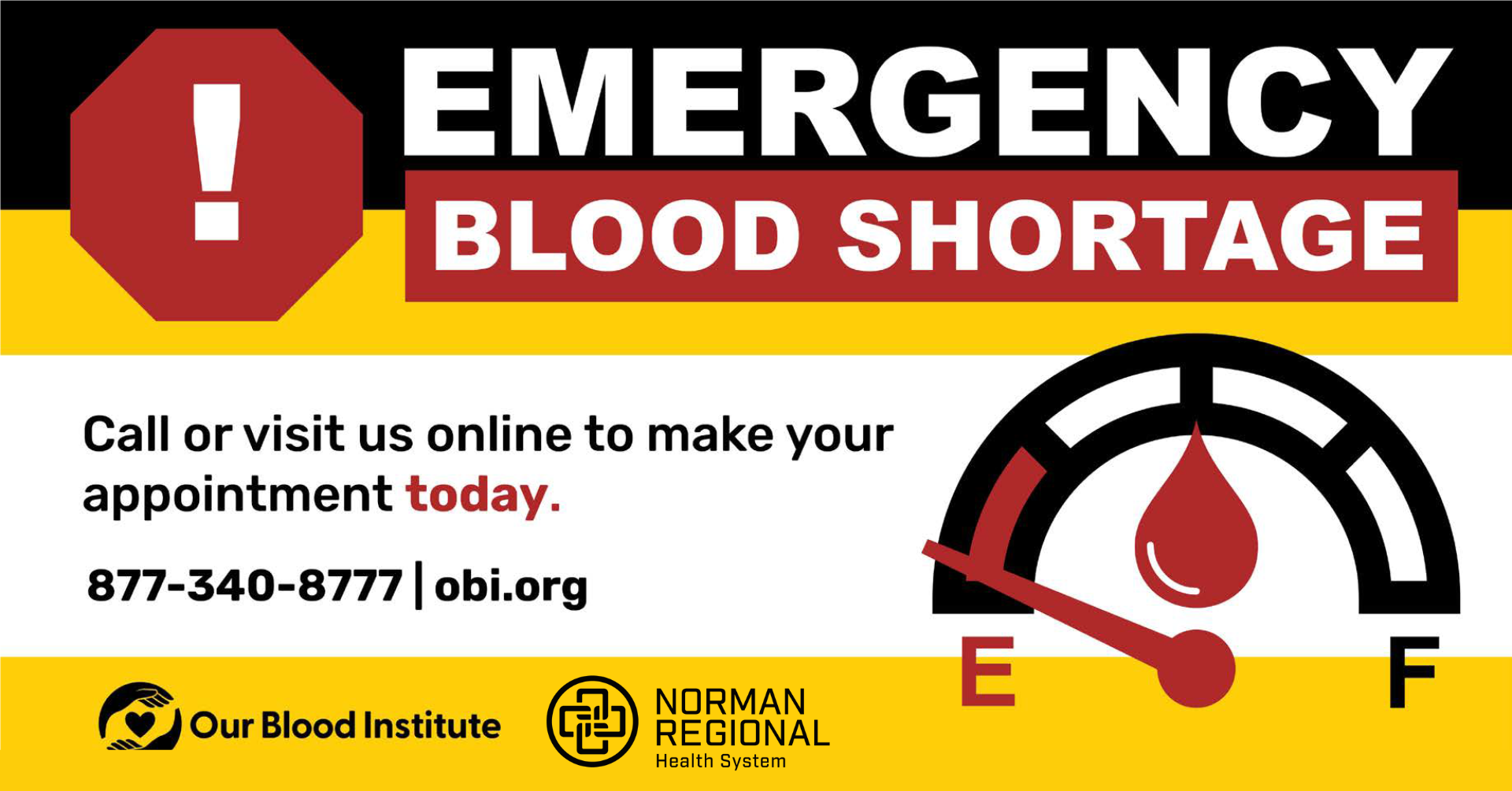 Norman Regional and Our Blood Institute are calling on our community to help save lives by donating blood at one of two upcoming blood drives. With an ongoing emergency blood shortage, your donation can make a critical difference.
