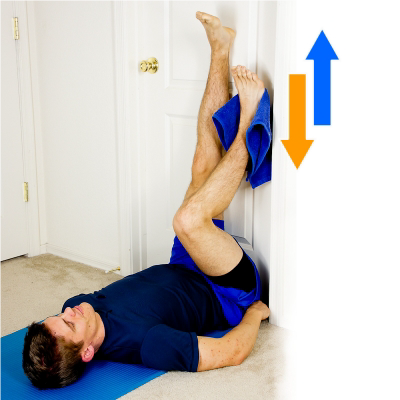 While lying on your back with both legs up a wall or closed door, slowly bend the affected knee so that the heel slides downward for a gentle stretch. Then actively return to the original position. To decrease friction, a towel should be placed under the foot and placed on a door which has a smoother surface.