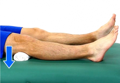 Place a small towel roll under your knee, tighten your top thigh muscle to press the back of your knee downward while pressing on the towel.