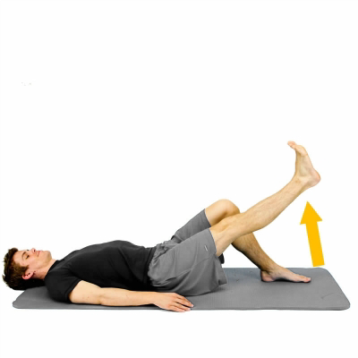 While lying on your back, raise up your leg with a straight knee. Keep the opposite knee bent with the foot planted on the ground.