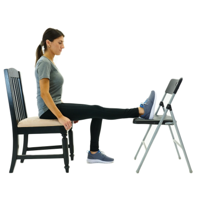 While seated, prop your foot up on another chair and allow gravity to stretch your knee towards a more straightened position.