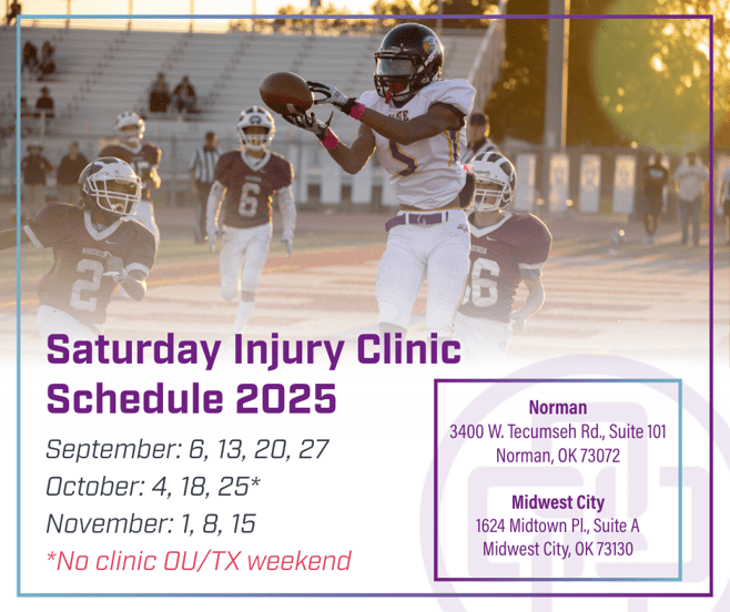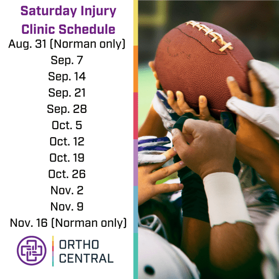 Ortho Central’s Saturday Injury Clinics are here to ensure you don’t have to wait to get back on the field. Starting this week, we’re offering free evaluations for high school sports injuries every Saturday from 8 to 9:30 a.m. Whether you’re in Norman or Midwest City, our specialized orthopedic team is ready to assess your injury and guide you on the quickest path to recovery or give you peace of mind knowing you are injury-free.